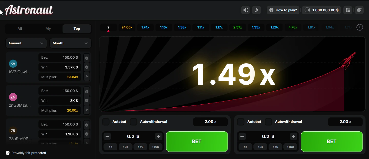Astronaut is an excellent choice for those who enjoy fast-paced crash games but seek a fresh, distinctive experience beyond typical themes common in an Aviator Astronaut game. It’s a crash game with unique visual and technical gameplay.
