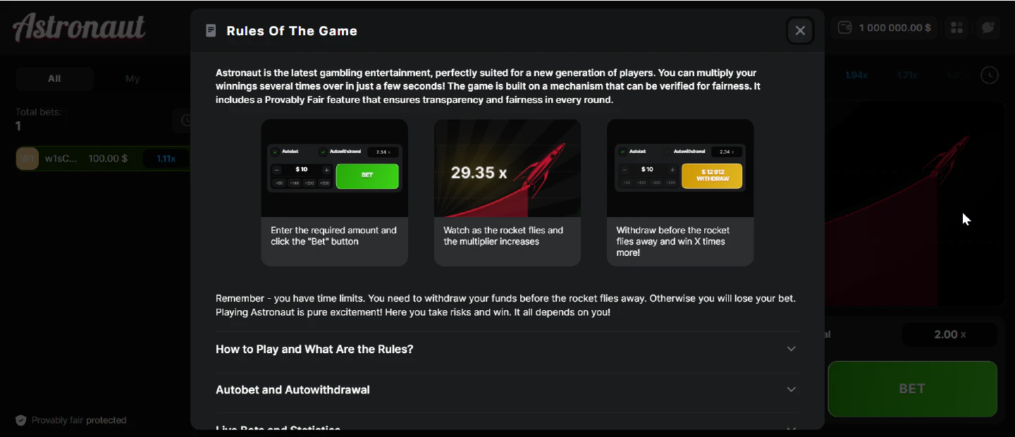 - Monitor Probability Stats: The Astronaut game shows live probabilities. If red odds are high, consider an early cashout.